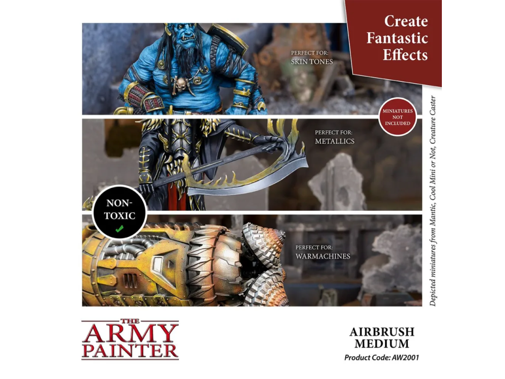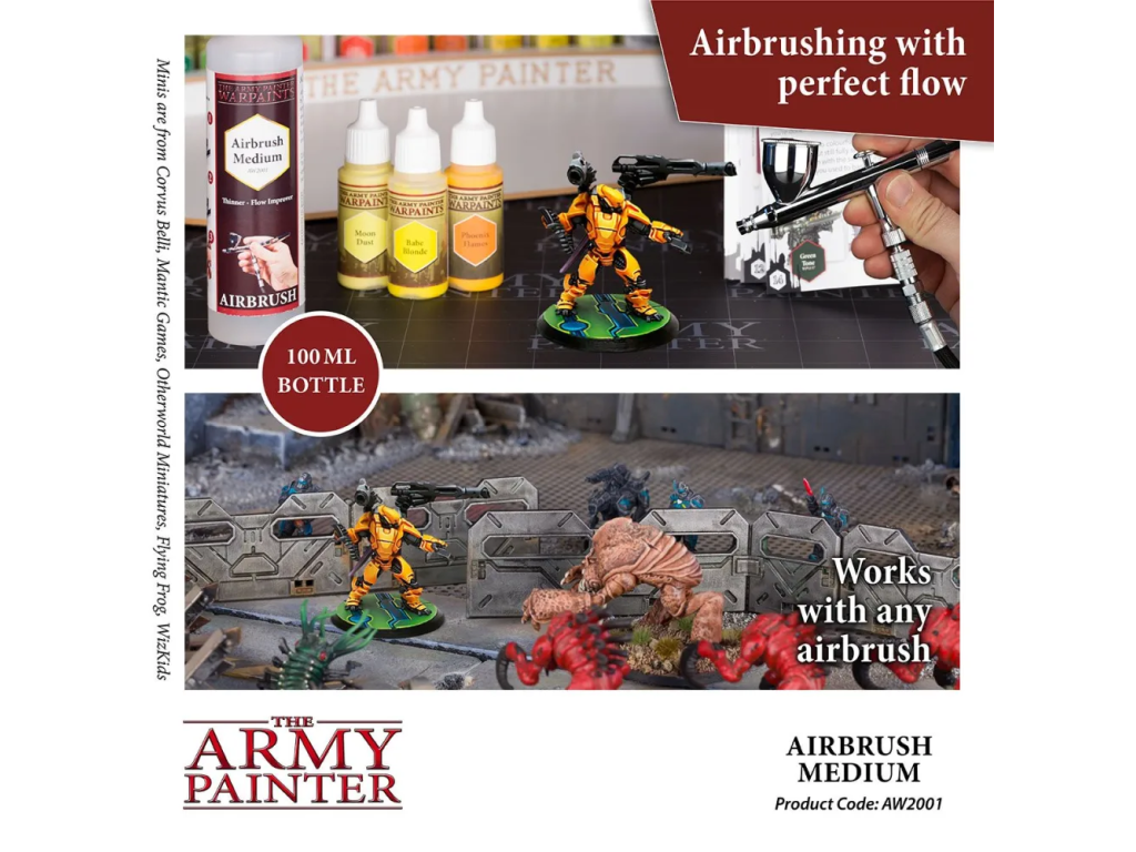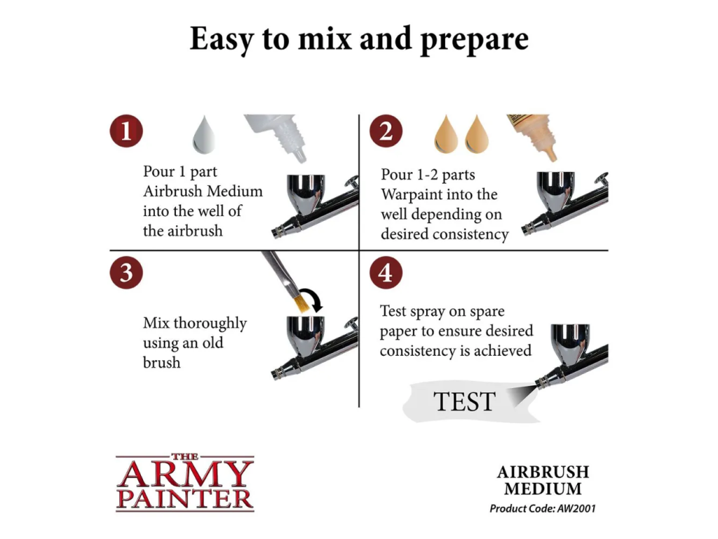 Lahvička obsahuje 100 ml média a je vybavena praktickým kapátkem pro přesné dávkování bez nepořádku. Doporučený poměr míchání je přibližně 1 díl Airbrush Medium na 1 až 2 díly Warpaint barvy, což umožňuje snadno upravit hustotu podle typu projektu i preferovaného stylu práce. Kapátkový systém oceníte při přesném míchání menších dávek i při pravidelném používání. Medium pomáhá zachovat vlastnosti barvy a podporuje plynulý průchod airbrushem. Díky tomu se snižuje riziko nepravidelného nástřiku nebo zanášení zařízení. Produkt je navržen tak, aby perfektně spolupracoval s barvami Army Painter Warpaints.