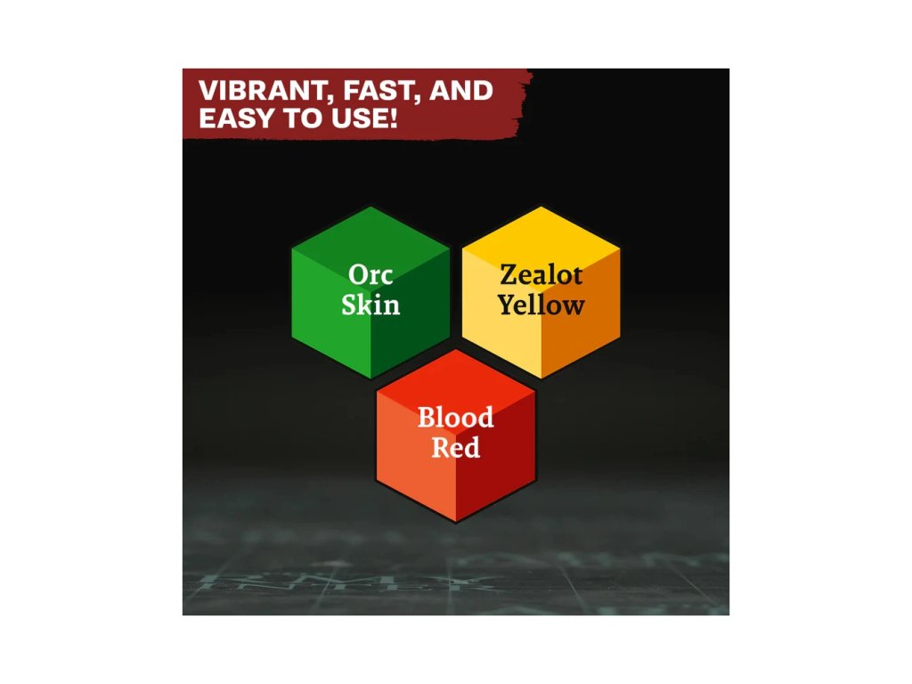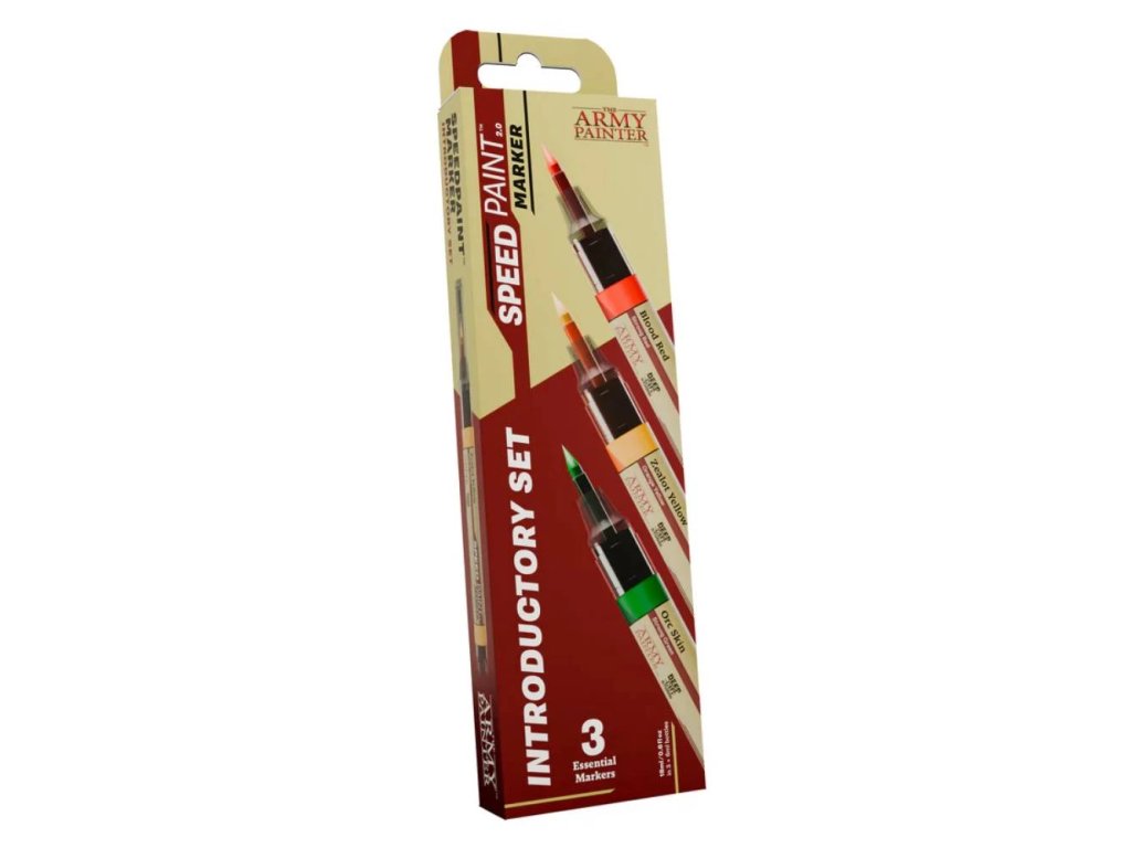 Introductory Set obsahuje tři syté a univerzální odstíny: Orc Skin, Zealot Yellow a Blood Red. Tyto barvy pokrývají široké spektrum použití, od kůže a zbroje až po výrazné detaily a akcenty. Inovativní technologie hrotů Felt-Tech zajišťuje precizní a rovnoměrné nanášení pigmentu bez potřeby štětce nebo palety. Barva je připravena k okamžitému použití a umožňuje plynulou kontrolu nad krytím. Markery jsou přenosné, praktické a minimalizují nepořádek při práci. Po použití se doporučuje skladovat je hrotem dolů, aby zůstaly v perfektní kondici.