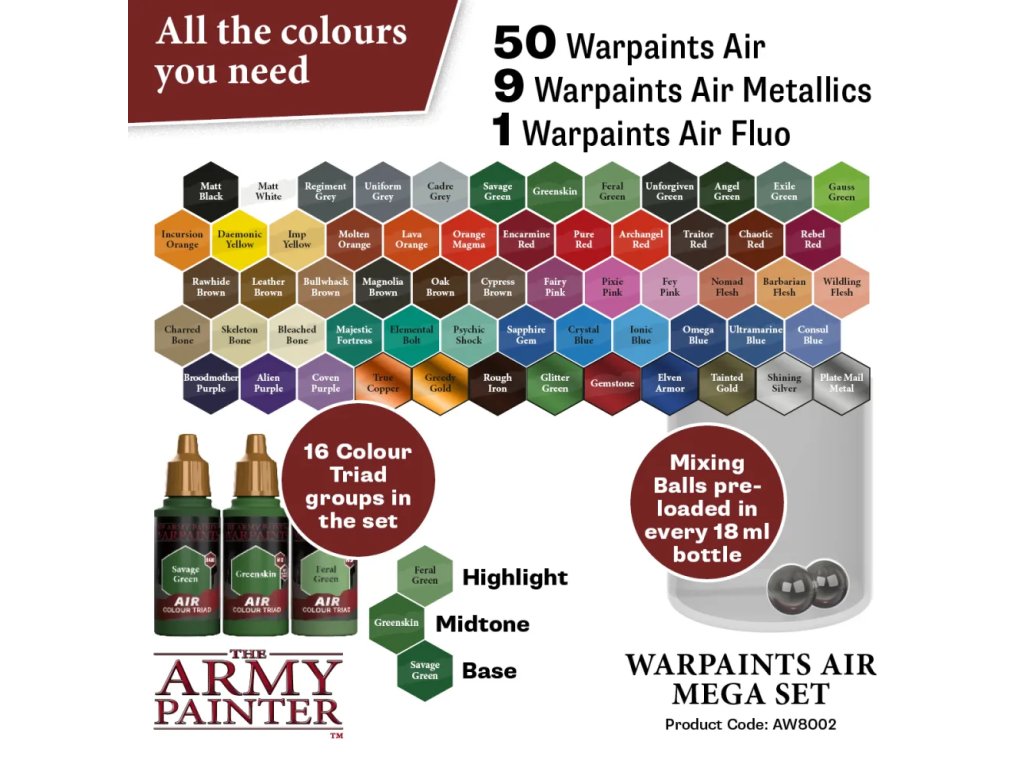 Sada obsahuje celkem 60 barev o objemu 18 ml: 50 × Warpaints Air, 9 × Warpaints Air Metallics a 1 × Warpaints Air Fluo. Tato kombinace umožňuje pracovat s klasickými odstíny, realistickými kovovými efekty i výraznými fluorescenčními akcenty. Metalické barvy dodají zbraním, brnění a mechanickým částem autentický lesk. Fluo odstín je ideální pro energetické efekty, zářící prvky nebo futuristické detaily. Každá lahvička obsahuje míchací kuličku pro důkladné promíchání pigmentu. Konzistence je optimalizována pro hladký průtok a minimalizaci rizika ucpání trysky.