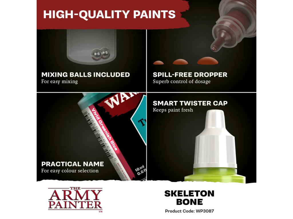 Skeleton Bone ocení fanoušci deskových her s figurkami, wargamingu, RPG miniatur i sběratelských modelů. Perfektně se hodí pro nemrtvé armády, fantasy monstra, starobylé dekorace i realistické historické projekty. Díky univerzálnímu odstínu ji využijete opakovaně v různých tématech a stylech malování. Je vhodná pro rychlé barvení většího množství modelů i detailní práci na jednotlivých kusech. Pokud chcete do své výbavy spolehlivou a všestrannou barvu, tento odstín vás nezklame. Ve světě miniatur jde o velmi užitečný základní tón.