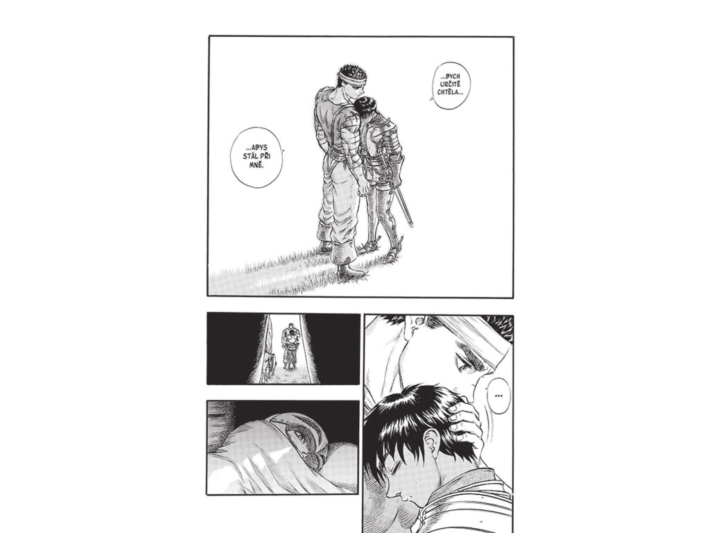 Uprostřed temnoty a zkázy však roste nový cit – Guts a Casca k sobě nacházejí cestu, která překonává utrpení i minulost. Jejich vztah je něžný a syrový zároveň, plný napětí, nevyřčených slov i bolestných vzpomínek. Po všech bojích a zradách si tito dva konečně dopřávají okamžik klidu, kdy se mohou dotknout toho, co znamená být člověkem. Miura s mimořádnou citlivostí ukazuje, že i ve světě temnoty může vzniknout jiskra naděje. Jejich sblížení nepůsobí jako únik, ale jako přirozený důsledek dvou zraněných duší, které si navzájem dávají sílu pokračovat. Přesto i nad touto chvílí visí stín – protože nic v Berserku netrvá věčně.