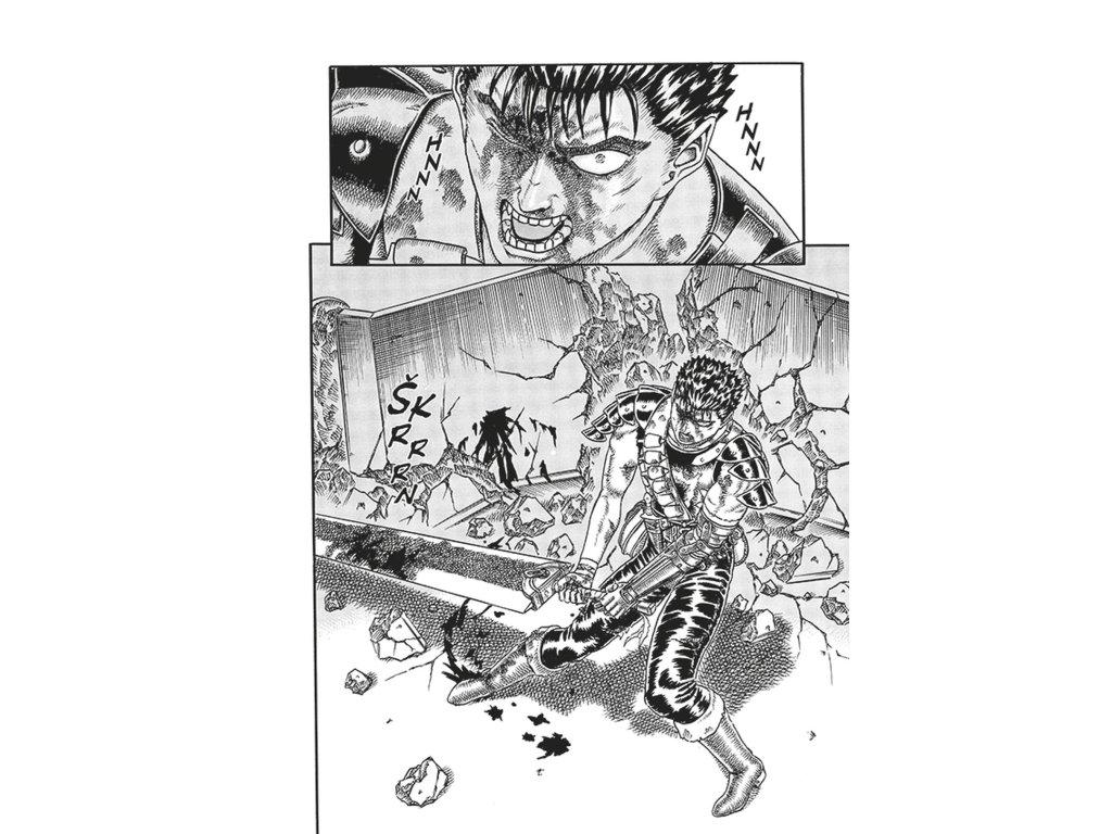 Guts se znovu ocitá na pokraji svých možností, poháněn hněvem, bolestí a nezkrotnou vůlí přežít. Jeho ďábelský protivník však není obyčejný nepřítel z masa a kostí – je to bytost, která přesahuje hranice reality a zosobňuje temnotu, proti níž se Guts celý život staví. Každý úder jeho obřího meče je zoufalým pokusem vzdorovat osudu, který se zdá být předem zpečetěn. Miura opět mistrně ukazuje kontrast mezi smrtelným člověkem a nadlidskou silou, která ho svírá ze všech stran. Krvavý souboj není jen fyzickým střetem, ale i bojem duše, která odmítá padnout. Guts dokazuje, že i v beznaději může člověk vzdorovat peklu samo o sobě.