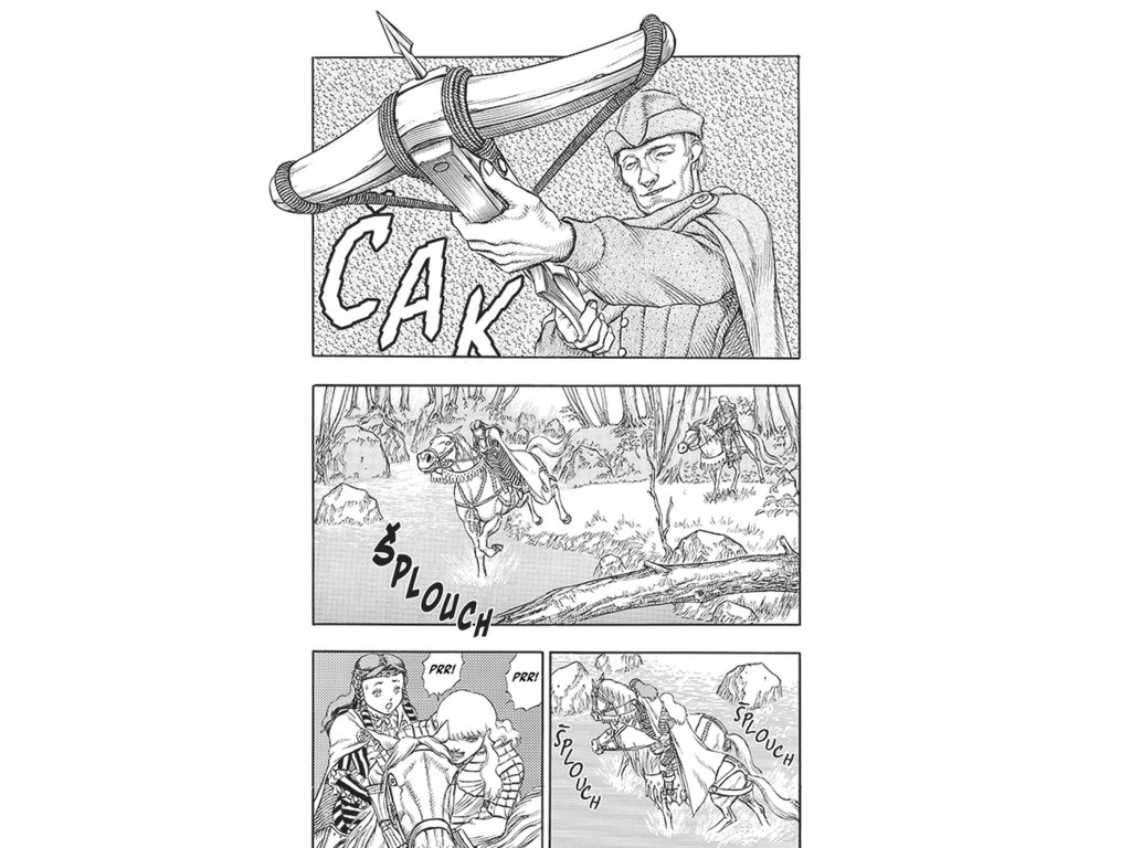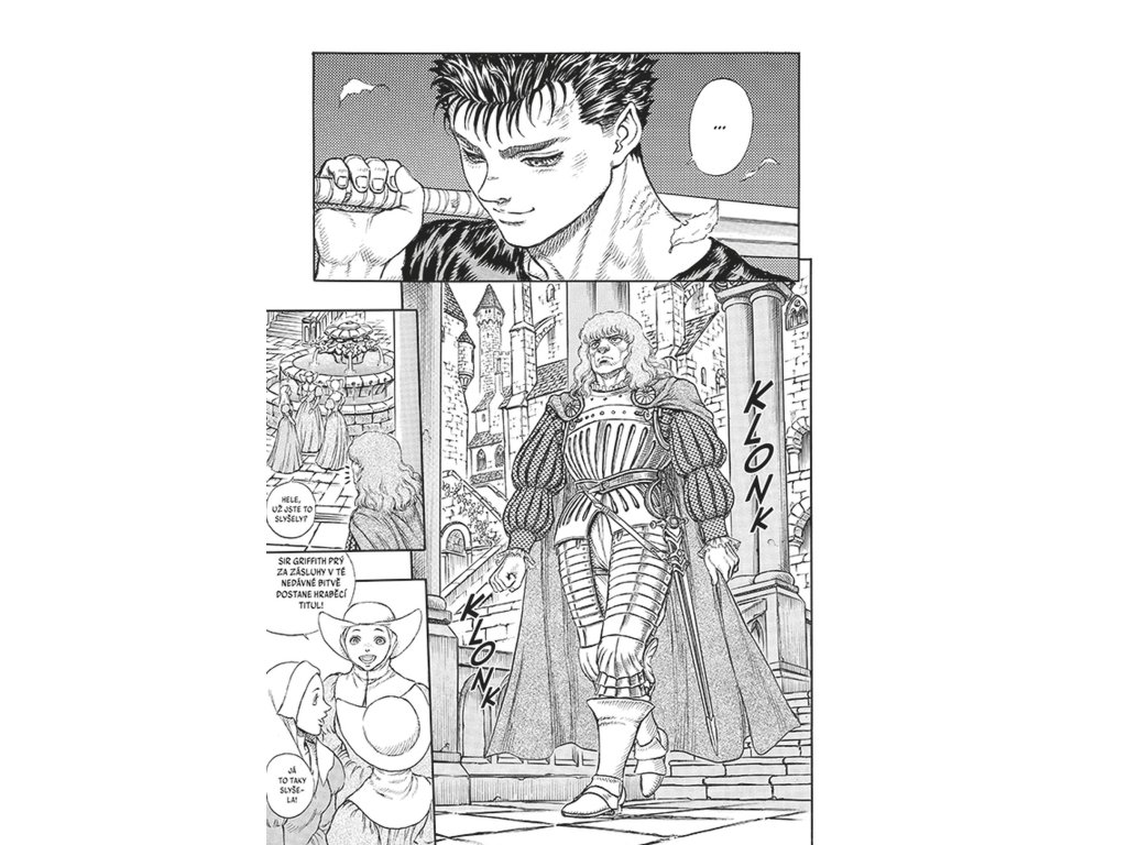Zatímco Jestřábi dál vítězí na bojištích, v královském paláci se rozehrává úplně jiná bitva – tichý souboj intrik, závisti a zrady. Urození šlechtici se obávají Griffithova vzestupu, který ohrožuje jejich postavení i vliv. Za leskem hostin a úsměvů se skrývají dýky, které čekají na vhodný okamžik, aby zasadily smrtící úder. Guts, který sleduje, jak se jeho velitel pohybuje na tenkém ledě politiky, začíná chápat, že svět války je proti dvoru plnému přetvářky vlastně čestný. Miura skvěle buduje atmosféru napětí a nevyhnutelné katastrofy, která visí ve vzduchu. Každé rozhodnutí může znamenat konec – nejen pro Griffitha, ale i pro všechny, kdo mu věří.