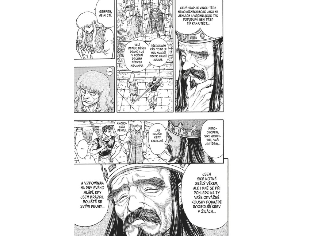 Griffith se nezastaví před ničím, aby dosáhl svého cíle – stát se někým, kdo překročí hranice obyčejného smrtelníka. Jeho sen o vlastním království se zdá být na dosah, a díky neuvěřitelné odvaze a strategickému génia se stává oblíbencem krále i lidu. Každý jeho krok však zároveň zvyšuje napětí mezi těmi, kdo mu závidí slávu a moc. Kentaró Miura zde s chirurgickou přesností ukazuje, jak se sen může proměnit v posedlost, a jak tenká je hranice mezi obdivem a strachem. Griffithova záře je oslepující, ale i nebezpečná – a ti, kdo se k němu přiblíží, riskují, že shoří v jejím plameni.