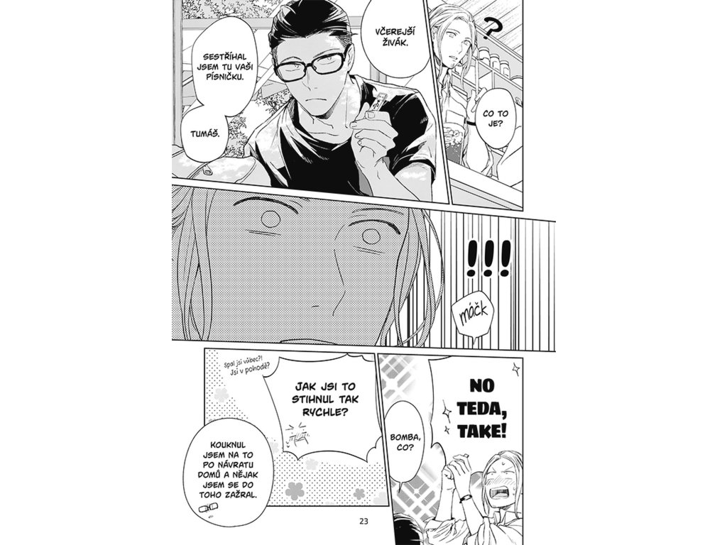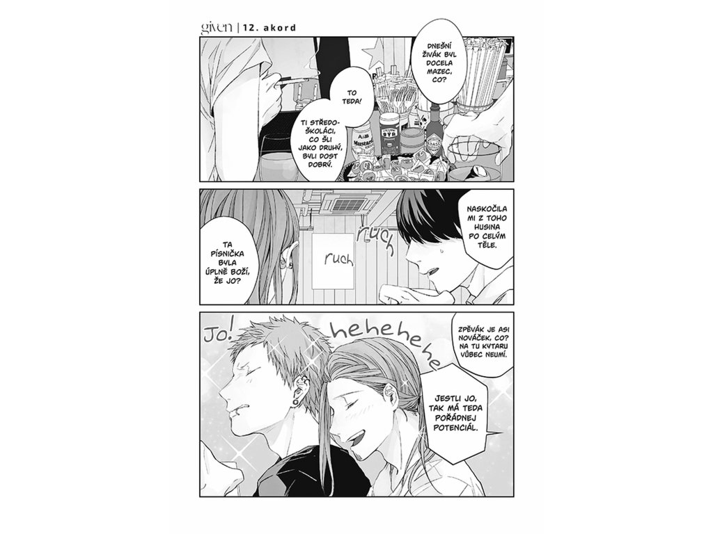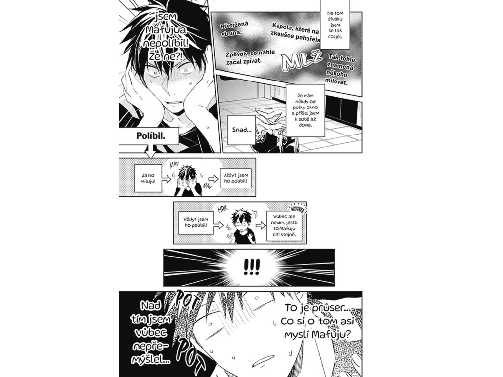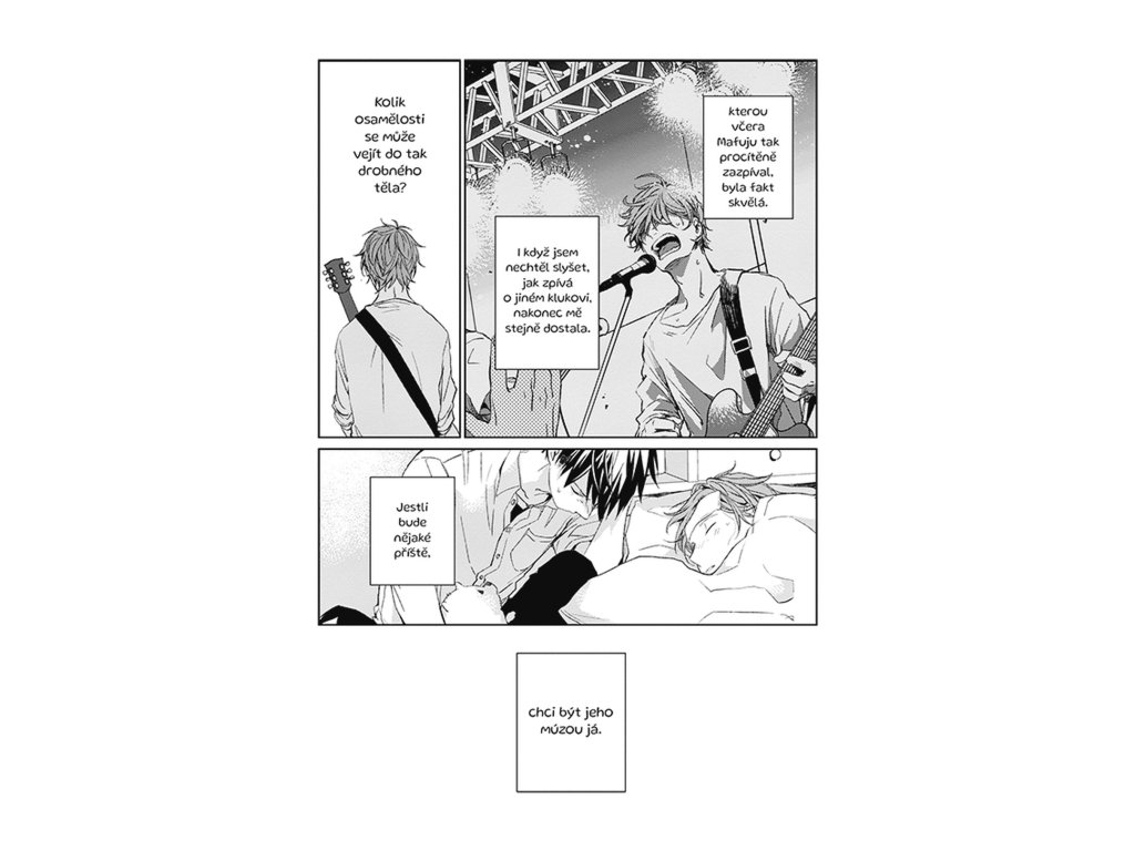 Mezi Mafujuem a Uenojamou mezitím klíčí nevinná, křehká láska, která se rodí pomalu a opatrně. Mafuju působí tichý a uzavřený, ale jeho přítomnost je pro Uenojamu čím dál důležitější. Každý pohled a každé slovo mají najednou větší váhu než dřív. Uenojama se snaží zjistit, jestli Mafuju cítí něco podobného, jenže odpovědi nepřichází tak snadno. Vztah se vyvíjí v jemných náznacích, které jsou zároveň krásné i bolestně nejisté. Hudba je pro ně společným jazykem, který dokáže vyjádřit to, co se slovy říct nedá. Právě díky tomu má jejich láska zvláštní hloubku, i když je stále na začátku. A čtenář má pocit, že každá další stránka může být rozhodující.