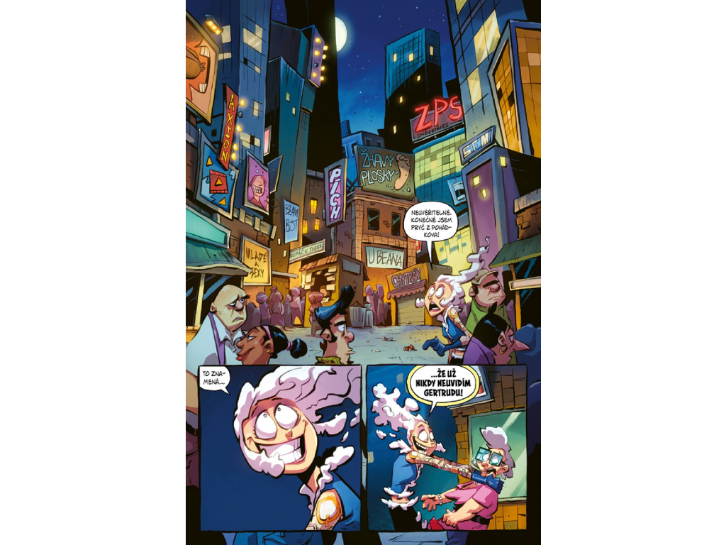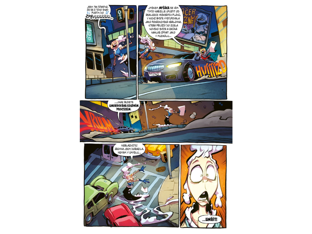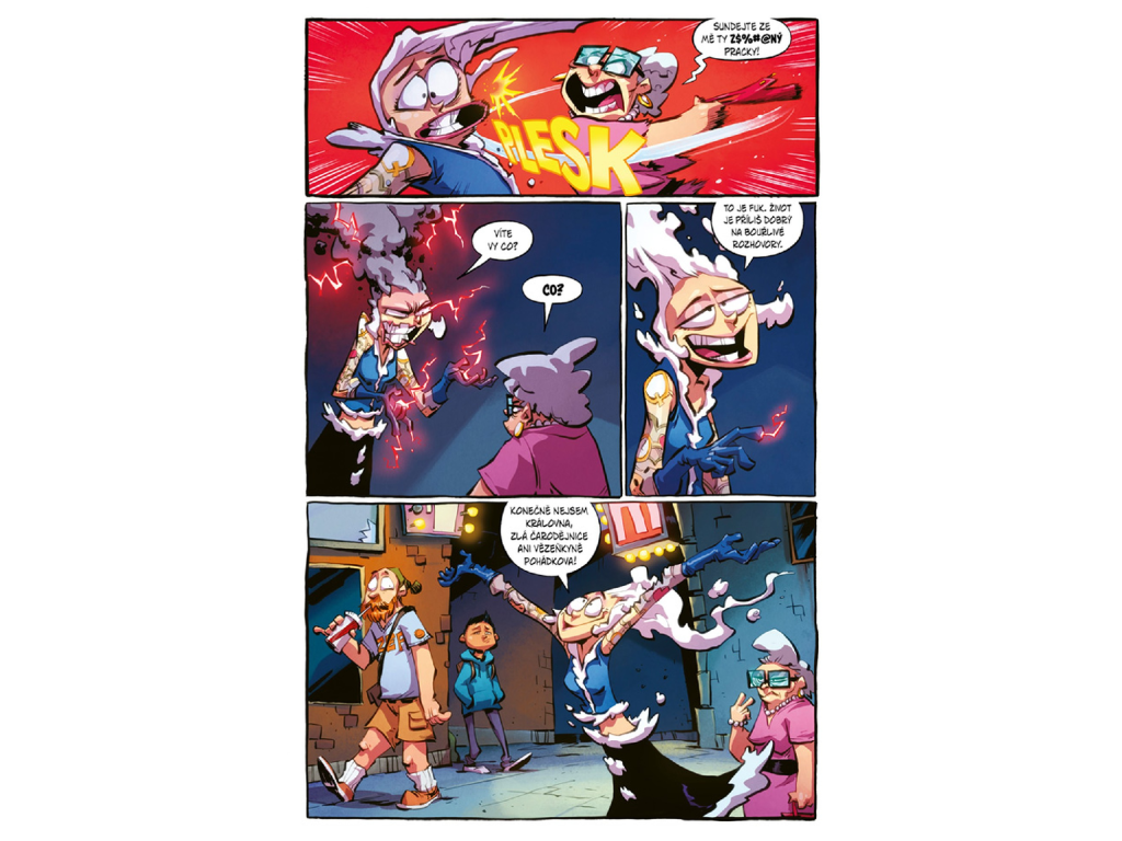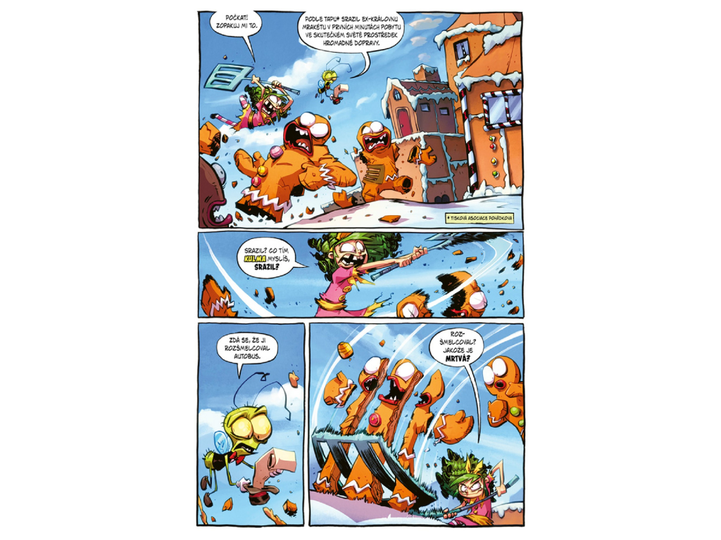 Gerda se musí popasovat s nečekanými následky svých činů, včetně střetu s Mrakétou, která skončila ve skutečném světě místo ní. Do toho se zaplétá s kozlíky Gruffy a dokonce se pouští do natáčení filmu o vlastním životě v Pohádkově. Každý z těchto momentů přináší další dávku absurdního humoru i nečekaných zvratů. Situace se postupně vyhrocuje až do bodu, kdy se Gerda promění v ještě větší monstrum, aby vyřešila starý problém. Příběh tak kombinuje akci, nadsázku a naprosté šílenství. Výsledkem je komiks, který tě nenechá ani na chvíli vydechnout.