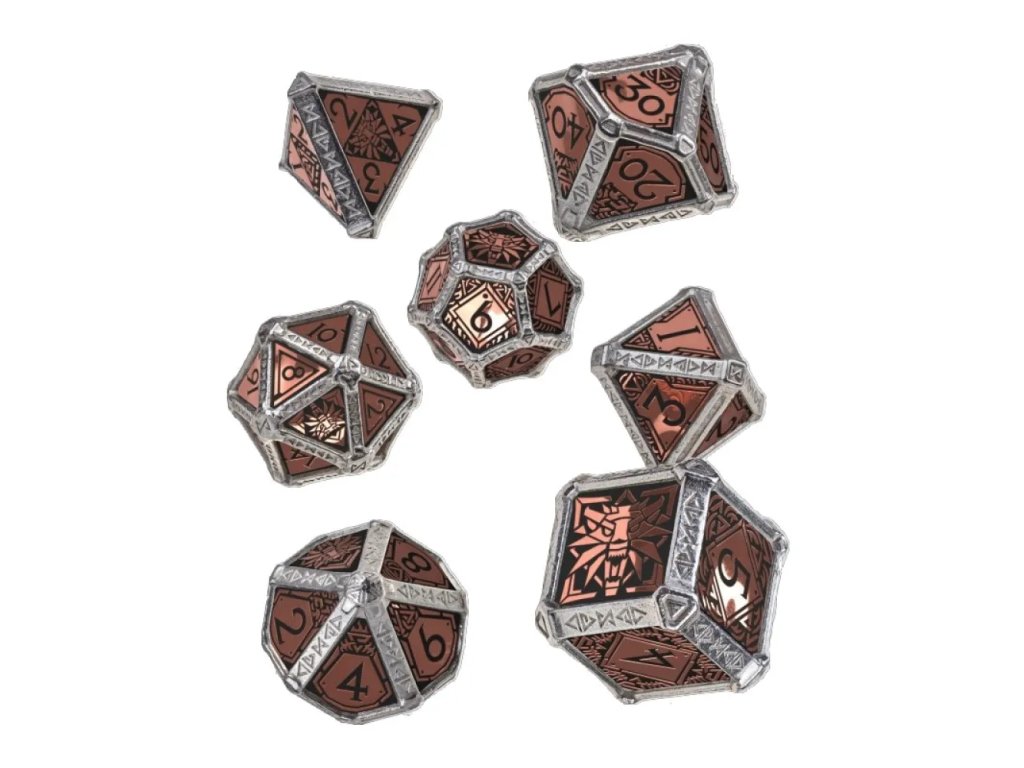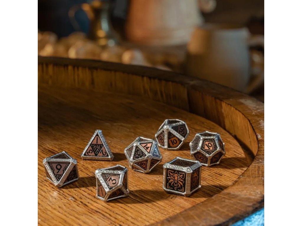Kombinace kovu a měděných destiček dává kostkám výjimečnou váhu, stabilitu a luxusní vzhled. Ruční vykládání mědi dodává každé kostce jedinečný charakter a drobné odchylky, které podtrhují řemeslnou kvalitu. Symboly Školy Vlka a zaklínačská znamení jsou jasně vyryté a dobře čitelné i při napjatých momentech hry. Stříbrný kov působí chladně a disciplinovaně, zatímco měď evokuje staré alchymistické laboratoře a zaklínačské dílny. Díky prémiovému zpracování od Q-Workshop jsou kostky odolné, vyvážené a příjemné na hod. Tato sada spojuje funkčnost, estetiku a lore Zaklínače v jeden působivý celek.