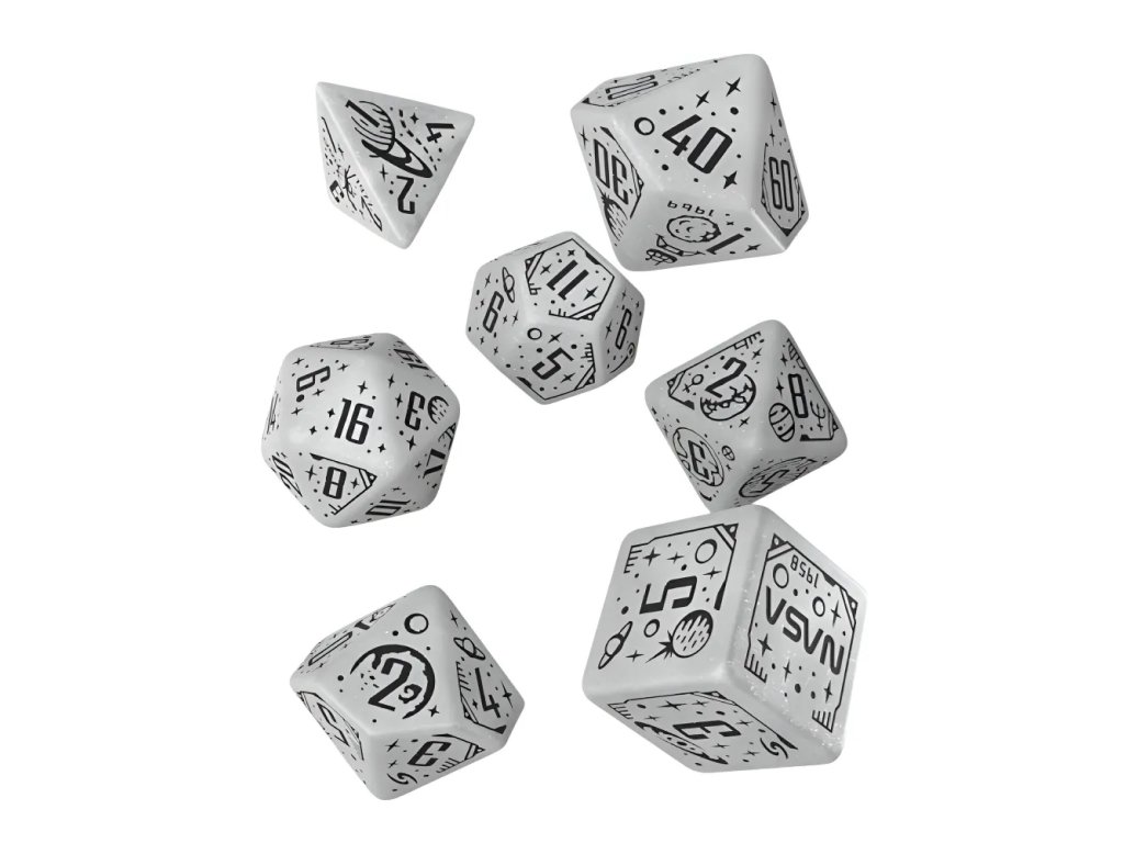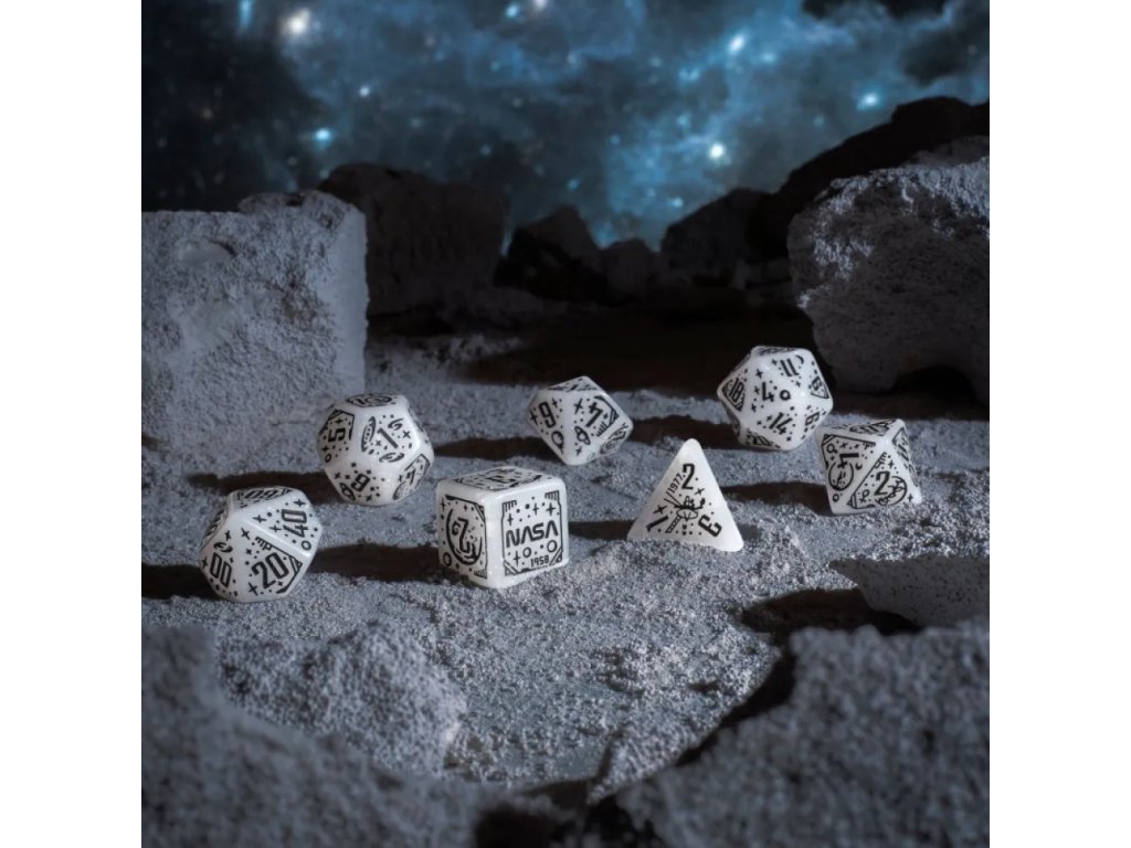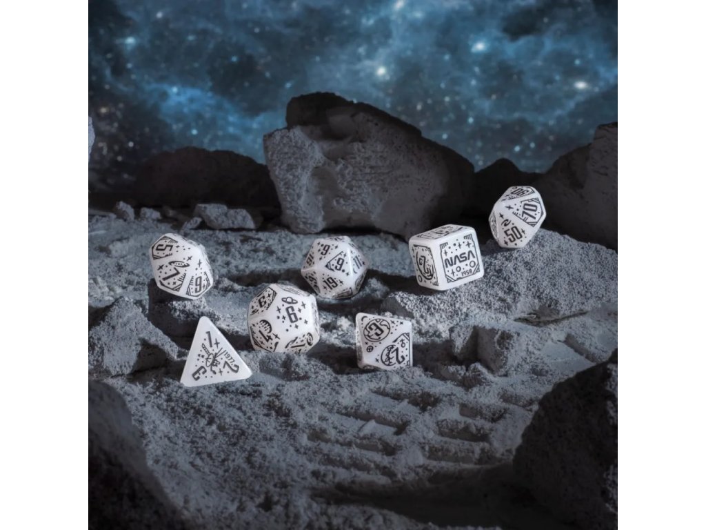 Design kostek odkazuje na klíčové okamžiky historie: od založení NASA v roce 1958 přes přistání Apolla 11 na Měsíci až po mise Hubbleova a Webbova teleskopu. Symbolika průzkumu vesmíru se odráží v každém detailu, což dává sadě jedinečný tematický charakter. Třpytivý efekt připomíná vzdálené hvězdy rozeseté v nekonečné tmě kosmu. Černé rytiny jsou jasně čitelné, takže kostky zůstávají plně funkční pro hraní i přes svůj výrazný design. Povrch je příjemný do ruky a zajišťuje plynulé kutálení po stole během napjatých momentů hry. Tato sada je ideální dárek pro hráče Dungeons & Dragons, Pathfinder RPG i fanoušky vědy a astronomie. A kdo ví — možná ti pomůže vyprávět příběhy o galaxii daleko, daleko odtud…