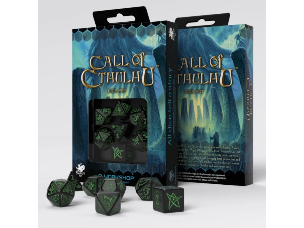 Balení obsahuje kompletní sadu sedmi kostek: čtyřstěnnou, šestistěnnou, osmistrannou, desetistěnnou, dvanáctistěnnou, dvacetistěnnou a procentovou kostku. Sada je přímo inspirována sedmou edicí Call of Cthulhu a skvěle zapadá do jejích mechanik i atmosféry. Ocení ji jak hráči, kteří chtějí stylový tematický doplněk, tak Strážci tajemství, kteří dbají na správnou hororovou náladu u stolu. Skvěle poslouží i sběratelům lovecraftovských herních doplňků jako výrazný designový kousek. Nejlépe se uplatní při vyšetřovacích scénářích, nočních sezeních a atmosférických kampaních plných napětí. Je ideální volbou pro každého, kdo chce posunout své hraní Call of Cthulhu o úroveň výš.