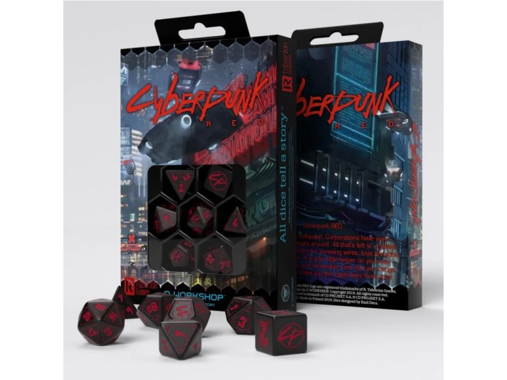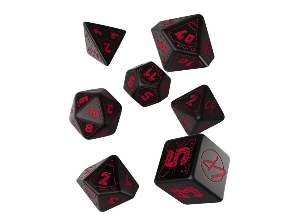 Sada obsahuje všech sedm základních mnohostěnných kostek potřebných pro většinu RPG systémů, zejména Cyberpunk Red. Najdete zde 1× k4, 1× k6, 1× k8, 1× k10, 1× k12, 1× k20 a 1× k% (procentovou) kostku. Díky tomu máte vždy po ruce správný nástroj pro boj, dovednosti, testy i kritické momenty hry. Kostky jsou navrženy tak, aby byly odolné a vhodné pro pravidelné hraní. Skvěle se hodí jak pro začínající hráče, tak pro zkušené veterány nočního města. Tato sada je ideální volbou, pokud chcete stylový a funkční doplněk k vašemu cyberpunkovému stolu.