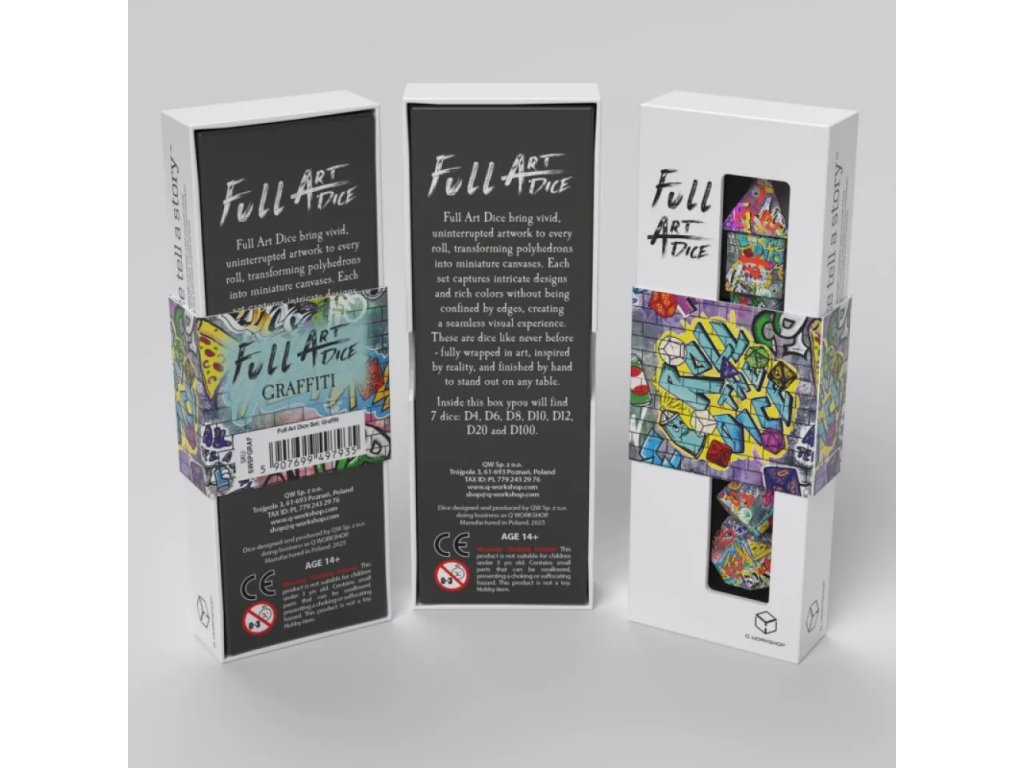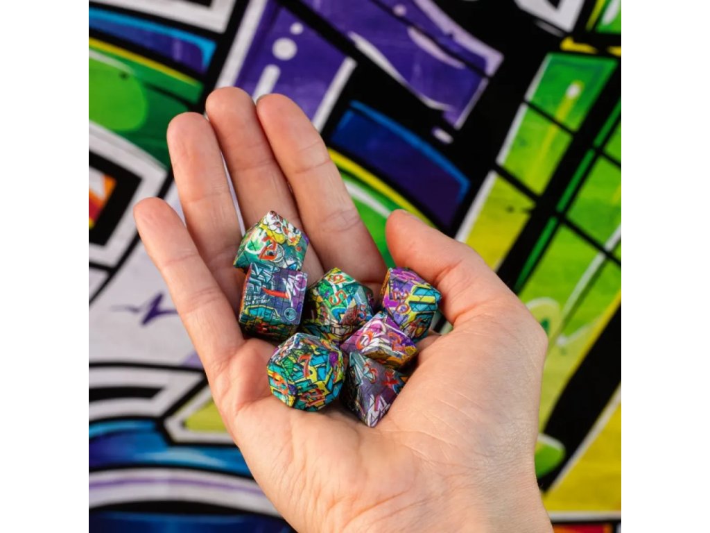 Tahle sada je určena všem hráčům, kteří se odmítají spokojit s průměrem a chtějí něco opravdu výrazného. Každá kostka působí jako malý kus živoucího graffiti, který byl právě stržen ze zdi města. Barevné spreje, neonové tahy a vrstvené textury se prolínají přes všechny hrany bez přerušení. Plnobarevný tisk přes celou kostku vytváří dojem neustálého pohybu a energie. Design nepůsobí jen jako dekorace, ale jako silné vyjádření osobitého stylu a kreativity. Full Art Dice Set – Graffiti je poctou rebelii, svobodě a odvaze být jiný, což z něj dělá ideální volbu pro hráče, kteří chtějí, aby jejich kostky měly vlastní hlas.