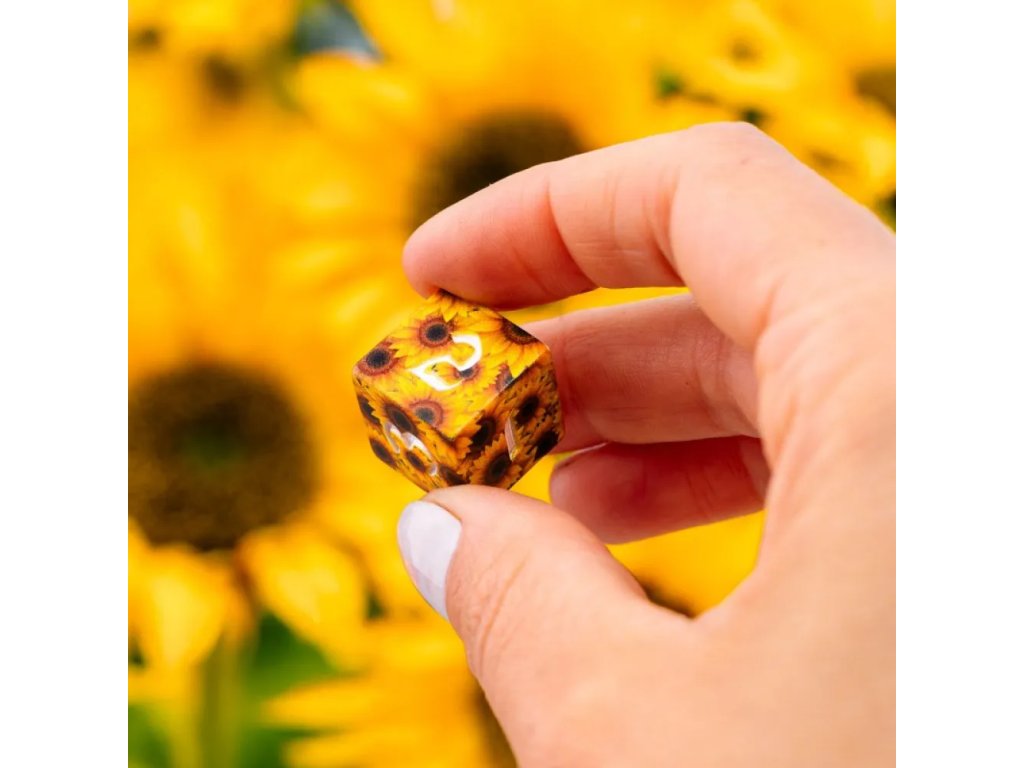 Tato sada působí jako malý fragment slunečnicového pole zachycený v kostce. Každá strana evokuje pocit tepla, světla a nekonečného léta, které nikdy nezapadá. Okvětní lístky slunečnic se přelévají přes hrany a plynule se propojují do živého, organického vzoru. Full-art design vytváří dojem, jako bys držel v ruce miniaturu krajiny zalité sluncem. Barevná hloubka a jemné přechody dodávají kostkám téměř malířský charakter. Celek působí harmonicky, přírodní a zároveň výjimečně, což z této sady dělá výrazný vizuální kousek na každém herním stole.