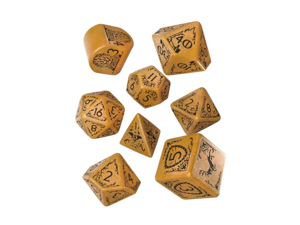Tahle oficiálně licencovaná sada obsahuje vše, co potřebuješ pro jakékoli stolní RPG. Uvnitř najdeš kompletní sadu sedmi kostek: k4, k6, k8, k10, k%, k12 a k20. Každá kostka je precizně zpracovaná tak, aby byla dobře čitelná i při napjatých herních momentech. Čísla jsou výrazně vyrytá a kontrastní vůči tmavému podkladu. Sada je vhodná pro Dungeons & Dragons, Pathfinder i další fantasy systémy. Díky svému vzhledu působí na stole dominantně a snadno upoutá pozornost spoluhráčů.