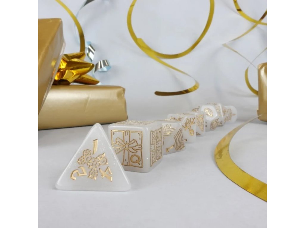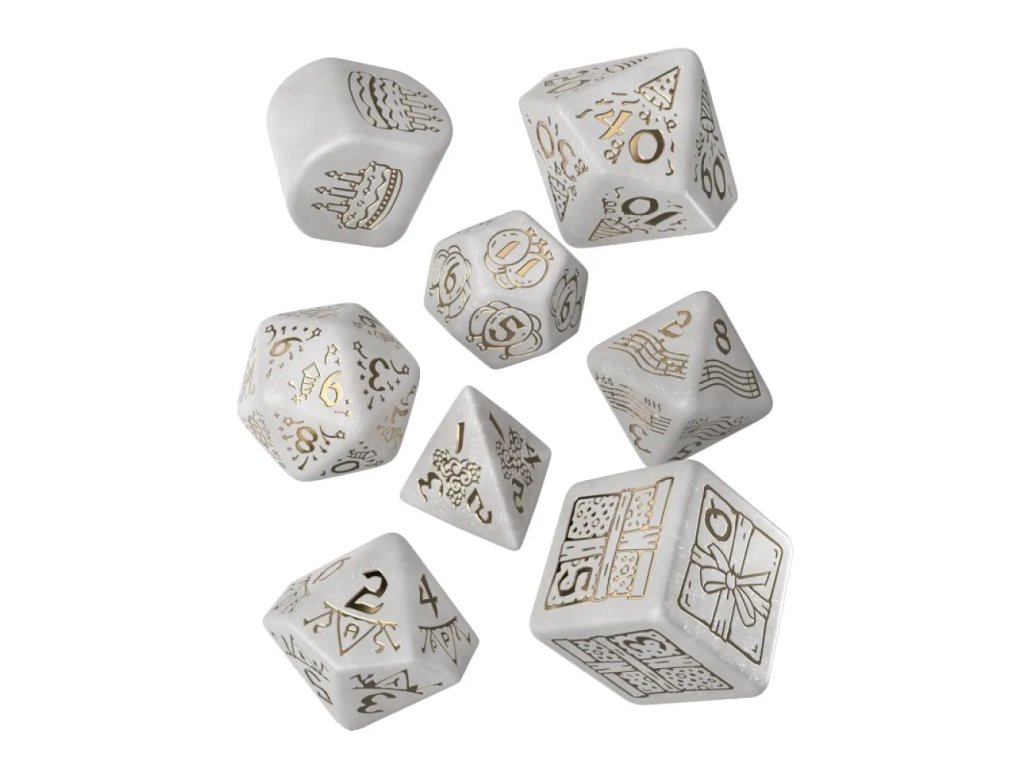 Oslav dvacáté výročí společnosti Q-Workshop stylově se sadou krásných jubilejních kostek, které v sobě nesou slavnostní atmosféru i herní eleganci. Osm bílých různostěnných kostek zdobených zlatými párty motivy působí jako luxusní, ale zároveň hravý doplněk každé herní seance. Jemné zlaté ornamenty evokují konfety, šampaňské a narozeninové oslavy, aniž by ztrácely přehlednost pro hraní. Sada je ideální nejen jako praktická herní výbava, ale i jako památeční artefakt k významnému výročí. Každý hod s těmito kostkami má nádech oslavy a připomíná, že hraní je především radost. Pokud hledáš kostky, které spojují styl, kvalitu a slavnostní atmosféru, tahle jubilejní sada je skvělá volba.