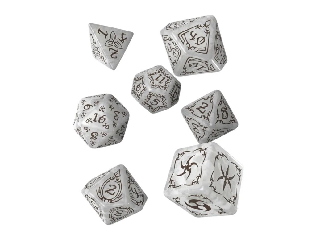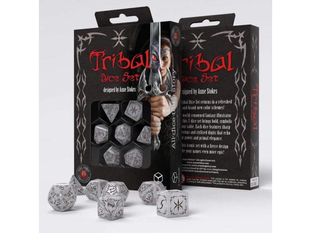 Design sady vytvořila světoznámá fantasy ilustrátorka Anne Stokes, jejíž tvorba je známá temnou, spirituální a rituální estetikou. Každá kostka je zdobena tribal motivy připomínajícími kmenové znaky, runy a prastaré rituální symboly. Tyto vzory působí organicky, jako by byly vytesány samotnou přírodou nebo vypáleny magickým ohněm. Perleťový lesk podkladu dodává kostkám éterický nádech, zatímco hnědé detaily připomínají zem, kořeny a pradávnou sílu. Povrch kostek je příjemný do ruky a zajišťuje plynulé kutálení po stole. Celkový vzhled sady je harmonický, mystický a zároveň silně tematický.