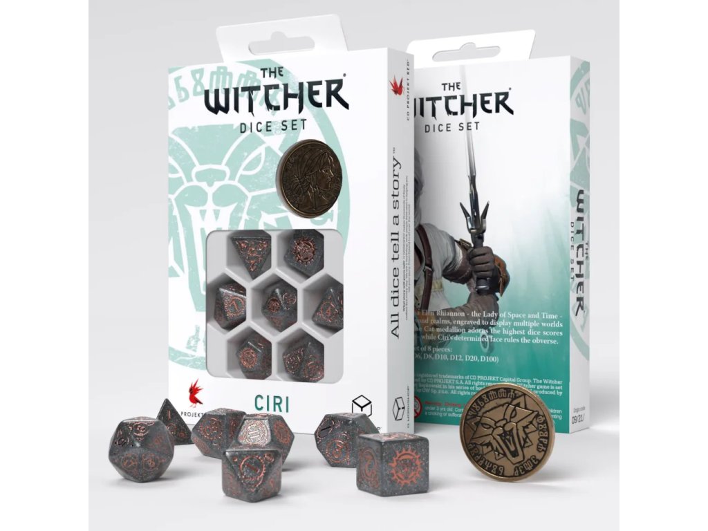Sada obsahuje všech sedm základních mnohostěnných kostek potřebných pro většinu RPG systémů. Najdete zde D4, D6, D8, D10, D12, D20 i procentovou kostku. Kostky jsou dobře čitelné, příjemné do ruky a vhodné pro pravidelné hraní. Velkým bonusem je sběratelská mince s portrétem Ciri o průměru 3 cm. Ta dělá ze sady nejen herní doplněk, ale i sběratelský předmět. Celé balení působí hodnotně a tematicky uceleně. Pokud hledáte kombinaci funkčnosti, stylu a sběratelské hodnoty, tato sada je skvělá volba.