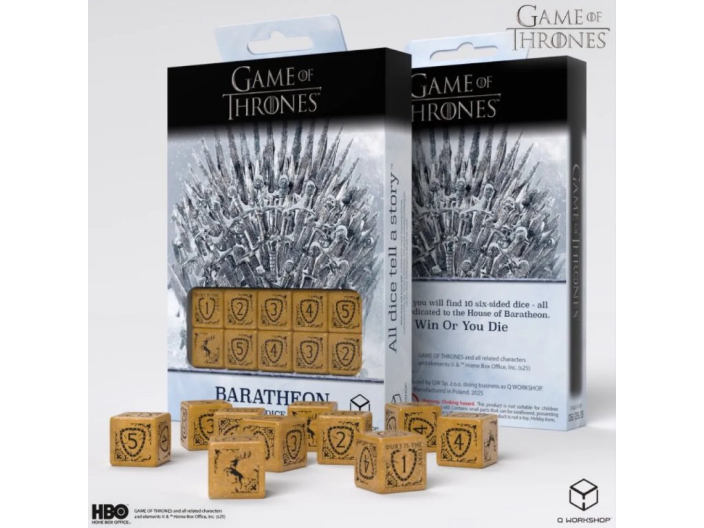 Přivolej sílu hromu, pýchu a neústupnost rodu Baratheon s touto oficiálně licencovanou sadou deseti šestistěnných kostek. Každá kostka je laděna do výrazné kombinace černé a třpytivě zlaté, která evokuje majestát i drsnou válečnou povahu Západozemí. Na každé kostce se vyjímá silueta korunovaného jelena – ikonický znak rodu Baratheon. Doprovází ji legendární heslo „Ours is the Fury“, které jasně připomíná, že Baratheoni nikdy neustupují. Design působí královsky, bojovně a zároveň sběratelsky hodnotně. Tyto kostky nejsou jen herním nástrojem, ale symbolem moci a odhodlání.