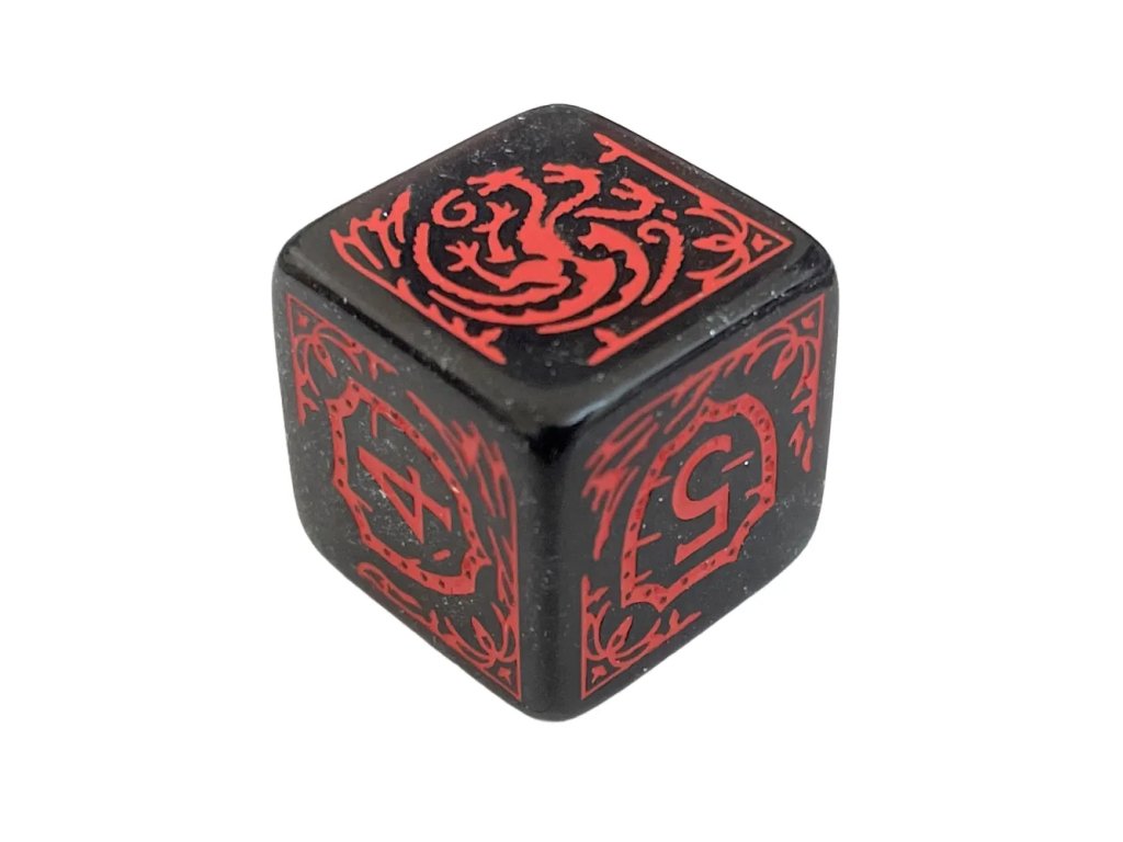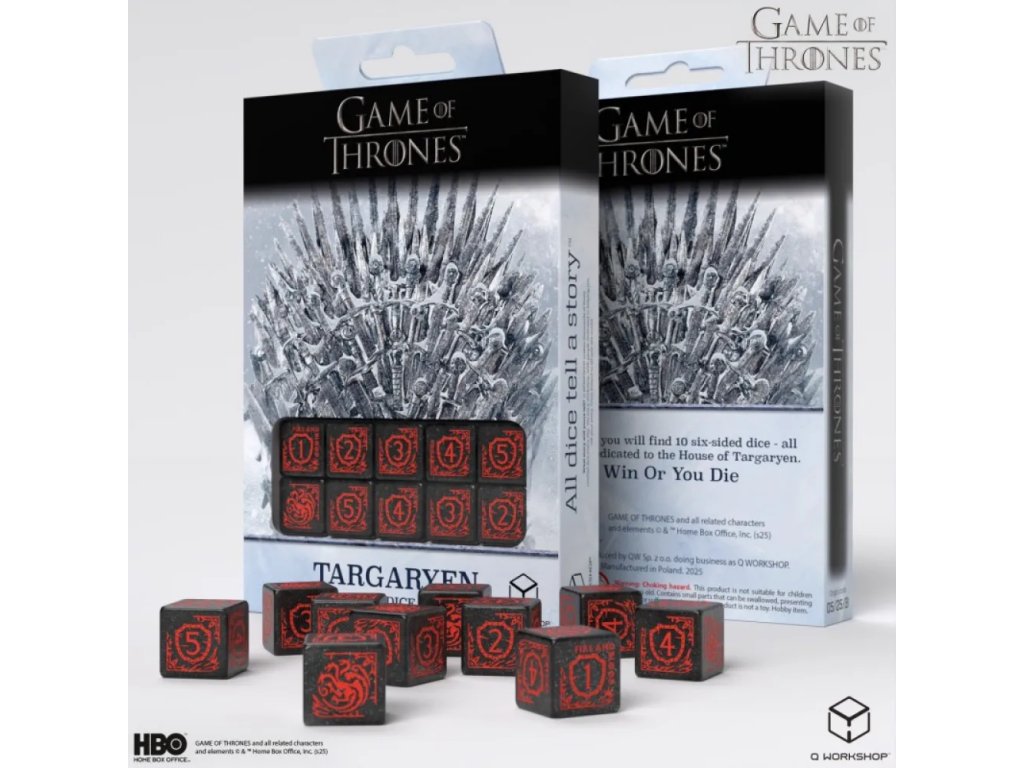 Přivolej sílu draků ke každému hodu s touto oficiálně licencovanou sadou deseti šestistěnných kostek inspirovanou rodem Targaryenů. Tato dávná dynastie ohně, krve a nezkrotné touhy po trůnu se promítá do každého detailu těchto kostek. Třpytivě černý podklad evokuje temné nebe nad Valyrií, zatímco zářivý symbol tříhlavého draka připomíná moc, která změnila dějiny Západozemí. Heslo “Fire and Blood” jasně vystihuje podstatu rodu Targaryenů – neústupnost, vášeň a ničivou sílu. Tyto kostky nejsou jen herní pomůckou, ale skutečným symbolem drakonické moci. Každý hod s nimi má nádech žhavého ohně a královské autority.