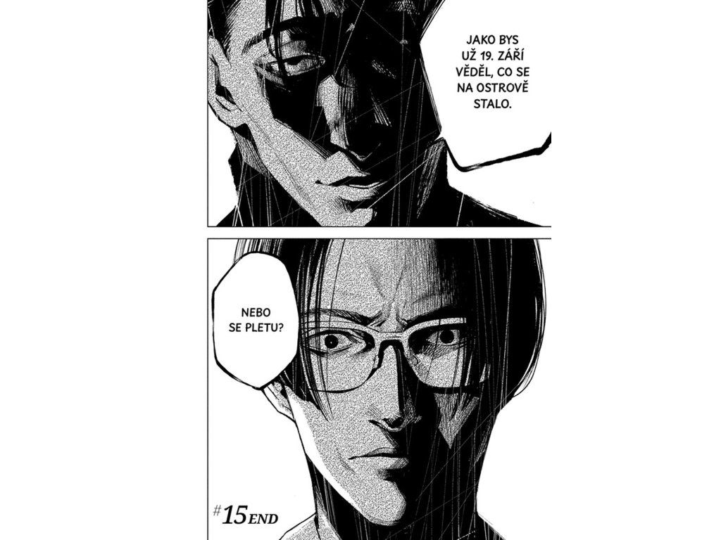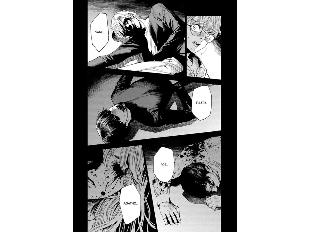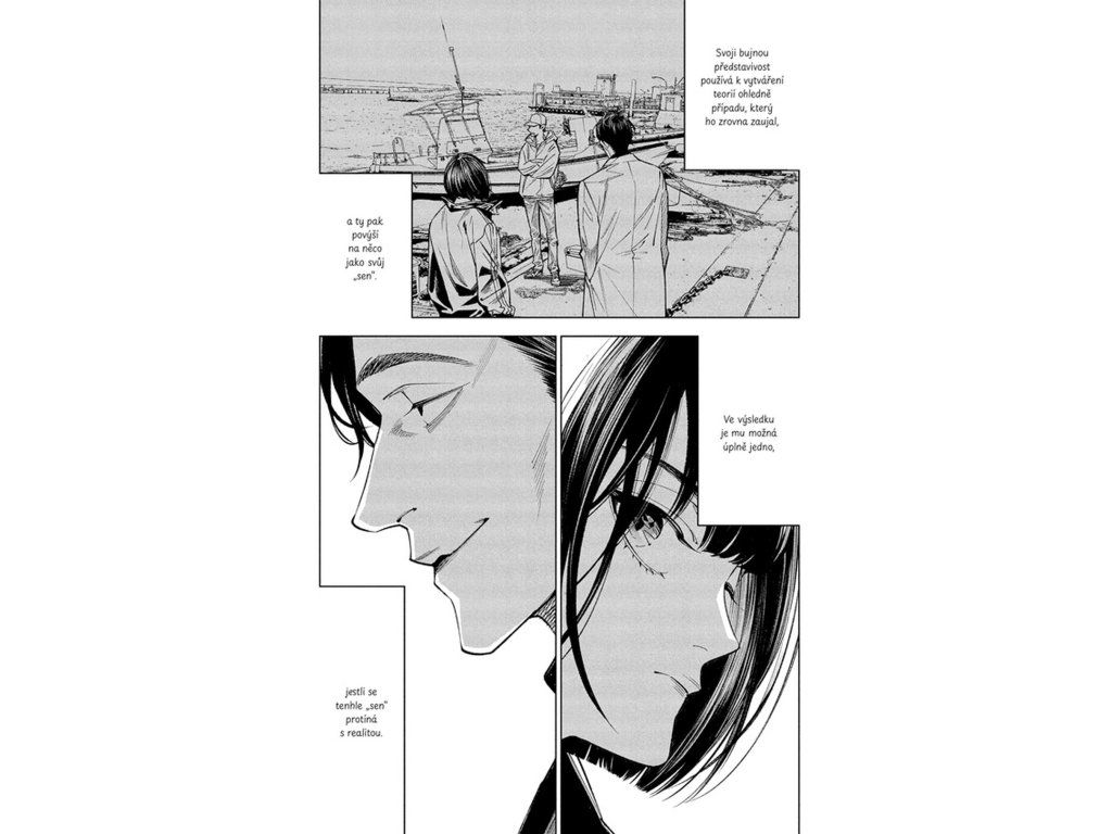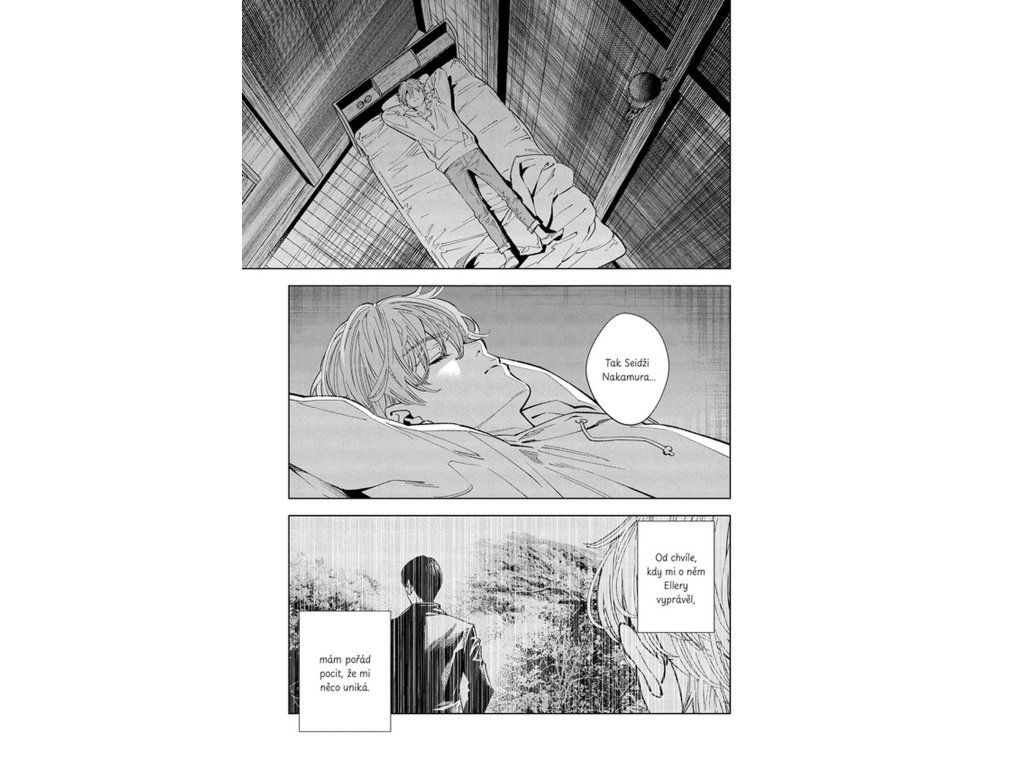 Zatímco se na ostrově odehrává tragédie, na pevnině pokračuje vyšetřování vedené Kawaminami a tajemným Šimadou. Společně se snaží odhalit pravdu o událostech spojených s Modrým sídlem a minulostí architekta Nakamury. Postupně odkrývají souvislosti, které propojují minulost s aktuálními vraždami. Dvojí dějová linie přináší napětí a nutí čtenáře skládat jednotlivé indicie dohromady. Každé nové odhalení posouvá příběh blíž k nevyhnutelnému vyústění. Pravda se pomalu vynořuje, ale za vysokou cenu.