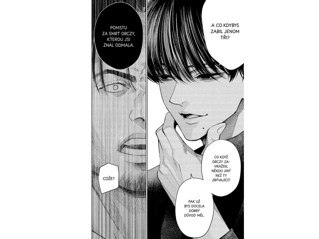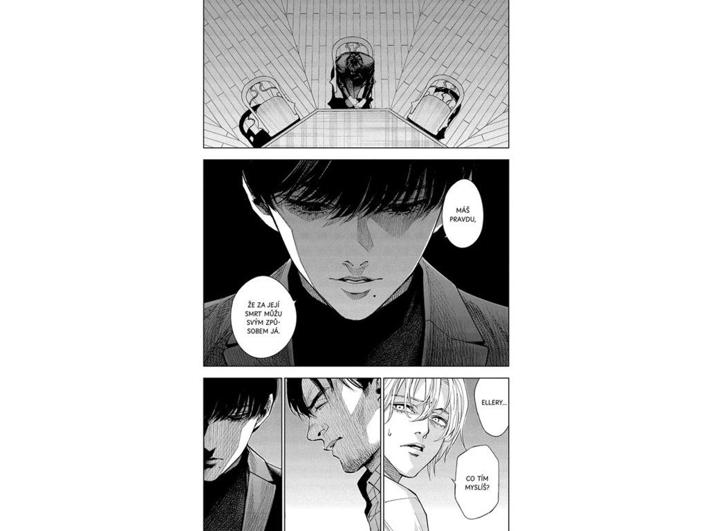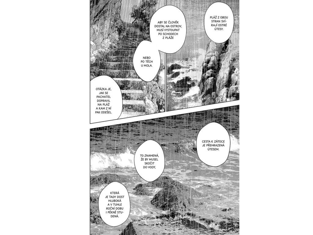 Zatímco se na ostrově schyluje k odhalení vraha, na pevnině pokračují Kawaminami a Šimada ve svém pátrání. Jejich cílem je objasnit okolnosti smrti Čiori, dcery architekta Nakamury. Obě dějové linie se postupně propojují a odhalují hlubší souvislosti mezi minulostí a současností. Každé nové zjištění posouvá příběh blíže k pravdě. Čtenář je nucen skládat jednotlivé indicie a přemýšlet nad motivy postav. Napětí je neustálé a vyvrcholení přináší silný emocionální dopad.