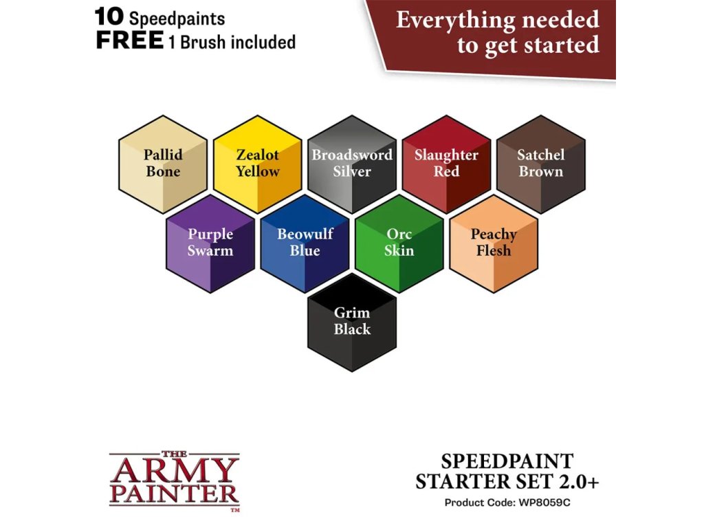 Balení obsahuje 10 pečlivě vybraných základních odstínů: Pallid Bone, Zealot Yellow, Broadsword Silver, Slaughter Red, Satchel Brown, Purple Swarm, Beowulf Blue, Orc Skin, Peachy Flesh a Grim Black. Každá lahvička má objem 18 ml a obsahuje dvě míchací kuličky pro dokonalé promíchání pigmentu. Konzistence barev je navržena tak, aby dobře stékaly do prohlubní a vytvářely přirozené stíny bez potřeby dalších kroků. Součástí sady je také štětec Basecoat Brush, který je ideální pro základní nánosy a rychlé pokrytí ploch. Přiložený anglický průvodce barvením ti pomůže pochopit princip práce se Speedpaint barvami. Celá sada je koncipována tak, aby umožnila okamžité zahájení práce bez nutnosti dokupovat další vybavení.