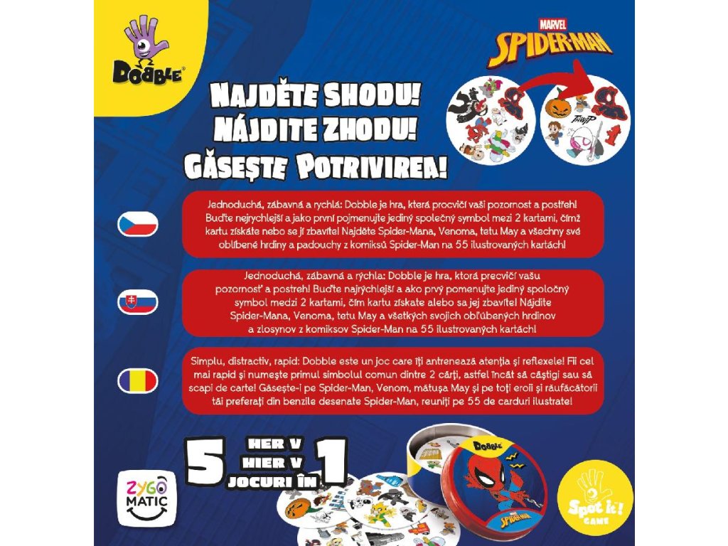 Dobble vstupuje do světa jednoho z nejslavnějších superhrdinů a přináší rychlou postřehovou zábavu v tematice Spider-Mana. Hra je založena na jednoduchém principu hledání jediného společného symbolu mezi dvěma kartami. Každé kolo prověří vaši pozornost, rychlé reakce i schopnost soustředit se pod tlakem. Díky svižnému tempu se partie nezadrhávají a hra je ideální i pro kratší herní chvíle. Dobble si zachovává svou přístupnost, ale díky tematickému zpracování osloví i fanoušky komiksového světa. Výsledkem je dynamická hra, která baví děti i dospělé.