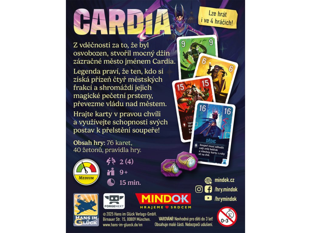 Podle prastaré legendy vzniklo město Cardia z vděčnosti mocného džina, který byl osvobozen ze svého vězení. Na oplátku stvořil zázračné město plné kouzel a čtyř mocných frakcí. Ten, kdo si dokáže získat jejich přízeň a shromáždí jejich magické pečetní prsteny, převezme vládu nad celým městem. Duel o město Cardia je svižná a strategická karetní hra pro dva hráče, která vás zavede přímo do srdce tohoto mýtu. Tvým cílem je porazit soupeře, obelstít ho chytře zahranými kartami a ukázat, kdo je skutečným vládcem. Díky své velikosti a herní době se hra hodí nejen na doma, ale i na cesty. Každá partie vypráví jiný příběh o tom, komu připadne vláda nad tímto kouzelným městem.