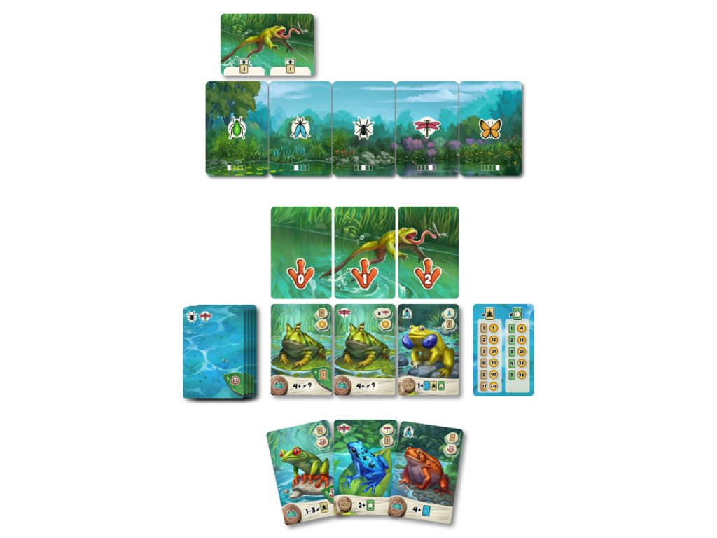 Centrálním prvkem hry je skákající žába, která přináší do poklidné atmosféry jezírka prvek napětí a interakce. Tato žába se pohybuje po středu hrací plochy a všichni hráči s ní mohou hýbat, čímž ovlivňují možnosti svých soupeřů i vlastní tahy. Její pohyb rozhoduje o tom, které karty jsou dostupné, a dokáže zcela změnit směr hry. Kromě plánování rozložení karet musejí hráči také myslet na to, že jejich žáby je potřeba krmit, aby zůstaly spokojené a přinášely body. To přidává další úroveň strategie, kde se vyvažuje rozvoj jezírka, péče o žabky a taktické využívání žáby uprostřed. Díky tomuto chytrému hernímu mechanismu se každá partie stává originálním zážitkem plným nečekaných zvratů.