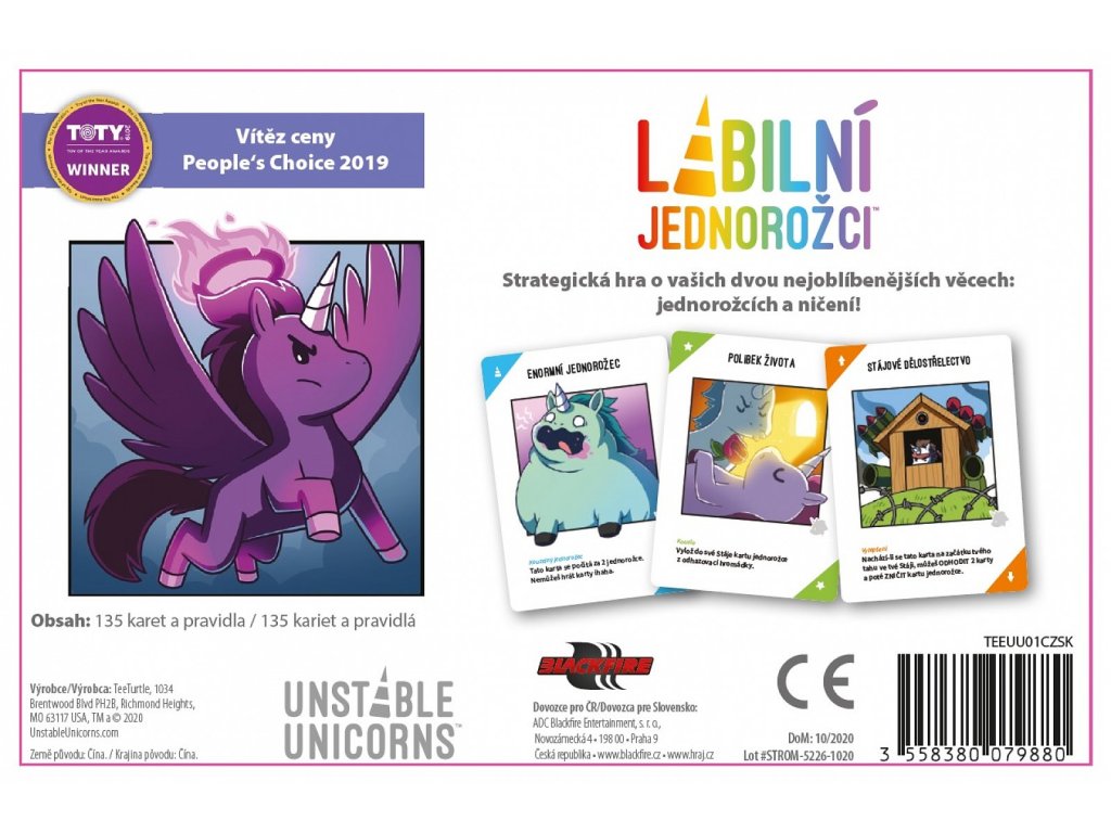 Labilní jednorožci jsou ideální hra pro 2 až 8 hráčů, kteří se nebojí přátelům trochu zatopit. Díky svižnému tempu, jednoduchým pravidlům a nekonečným možnostem kombinací je každá hra jiná a stejně zábavná. Stačí pár kol a z nevinné karetní hry se stává nelítostný souboj, kde zrada a pomsta patří ke hře stejně jako třpytky a duhy. Krabice je kompaktní, takže si ji snadno vezmete na cesty, do kavárny nebo na večírek. Ať už hrajete s rodinou, přáteli nebo herní partou, čekají vás výbuchy smíchu a pořádná dávka (ne)magického chaosu. Kdo z vás se stane vládcem duhové apokalypsy?