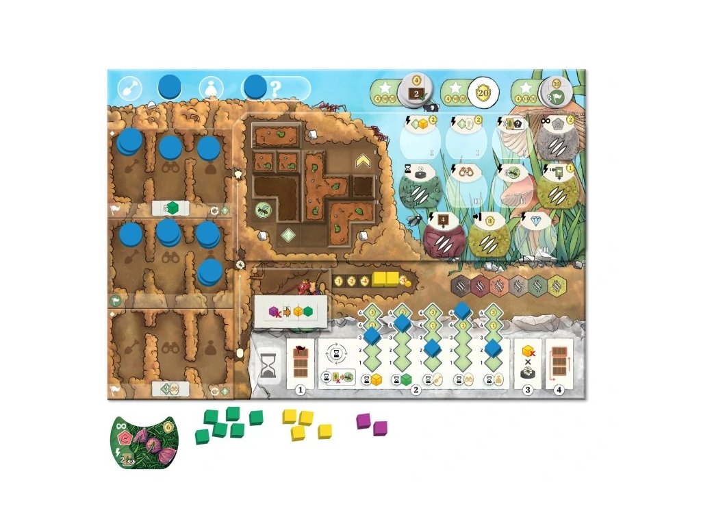 Ve svém tahu si vybíráš jednu z šesti hlavních akcí, jako je kopání, průzkum, sběr nebo líhnutí. Síla akce závisí na počtu mravenců, které do ní investuješ, což přináší důležitá strategická rozhodnutí. Klíčovou roli hraje životní cyklus kolonie, kde spravuješ vajíčka, larvy a dospělé mravence. Každá fáze nabízí různé možnosti a efekty, které ovlivňují další vývoj hry. Specializace mravenců na kopáče, průzkumníky a sběrače přidává další vrstvu taktiky. Díky tomu musíš neustále optimalizovat své zdroje a plánovat několik tahů dopředu.