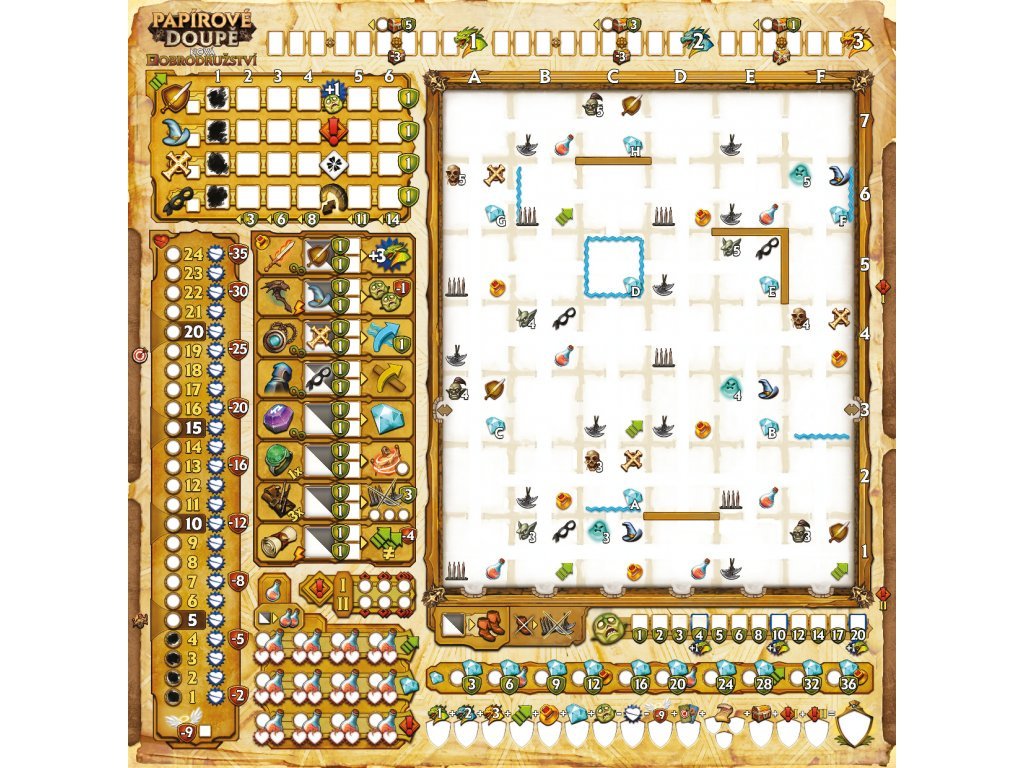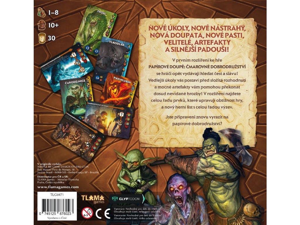 Rozšíření Nová dobrodružství ke hře Papírové doupě: Čmarovné dobrodružství přináší čerstvou dávku napětí, výzev a fantazie. Opět se ujmete velení nad čtyřčlennou družinou hrdinů a vydáte se do nového doupěte, které je ještě nebezpečnější než to předešlé. Čekají na vás silnější monstra, záludné pasti a vedlejší úkoly, které vás odmění slávou nebo mocnými artefakty. Herní principy zůstávají přístupné, ale nová mechanika přináší více možností, jak plánovat a bodovat. Cílem je opět získat nejvíce slávy do konce osmého kola – ale cesta k vítězství je nyní o poznání drsnější. Nová dobrodružství potěší všechny, kdo si oblíbili kreslící a taktické mechaniky původní hry.