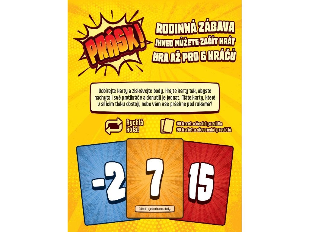 Prásk! je rychlá karetní hra, ve které jde o jediné – nepřekročit hranici a neztratit všechno. Každé kolo přináší rostoucí tlak, kdy se hráči snaží získat body a zároveň donutit soupeře udělat chybu. Stačí jeden špatný tah a součet přesáhne jednadvacet, což znamená okamžitý konec kola bez bodů. Právě tento jednoduchý princip vytváří silné napětí a emoce u každého stolu. Hra je přístupná, ale zároveň nutí přemýšlet nad každým krokem. Každé rozhodnutí může být to poslední, které ještě udržíš pod kontrolou.