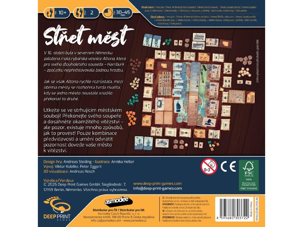 Střet měst je kompaktní hra pro dva hráče, která tě přenese do období soupeření mezi Hamburkem a Altonou. Každý hráč se ujímá jednoho z měst a snaží se získat převahu nad svým protivníkem. Navzdory malé krabičce nabízí hra překvapivě hluboký strategický zážitek. Atmosféra rivality je cítit v každém tahu a každé rozhodnutí má váhu. Hra je ideální pro hráče, kteří mají rádi přímé souboje bez zbytečných prvků náhody. Vítězství zde závisí čistě na tvé schopnosti plánovat a přemýšlet dopředu.