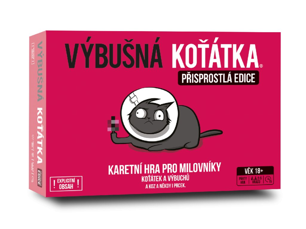 Výbušná koťátka: Přisprostlá edice přináší vše, co máte na klasické verzi rádi – výbuchy, podrazy, napětí a strategii – ale přidává k tomu pořádnou dávku dospělého humoru. Tahle verze je určena všem, kteří se nebojí trochu oplzlosti a nebojí se smát na hranici vkusu. Jde o plnohodnotnou verzi populární hry, v níž si hráči dobírají karty, snaží se vyhnout výbušnému koťátku a zároveň škodit ostatním. Mechanika zůstává stejná: ruská ruleta s koťaty, ale tentokrát pořádně přikořeněná. Hra je stejně jednoduchá, svižná a chytlavá jako originál, ale díky nové grafice a tématu má úplně jiný, mnohem ostřejší šmrnc. Připravte se na to, že tahle verze není pro děti – ani pro slabé žaludky.